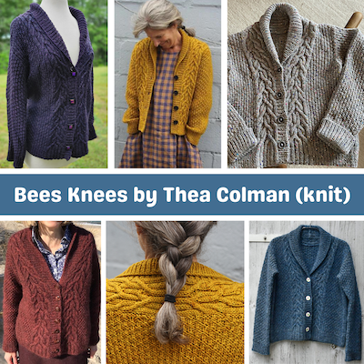 Bees Knees is a knit cardigan with bands of cable detail, a textured stitch pattern throughout the sleeves and body, and an optional shawl collar. It is easy to customize the length of this sweater.
